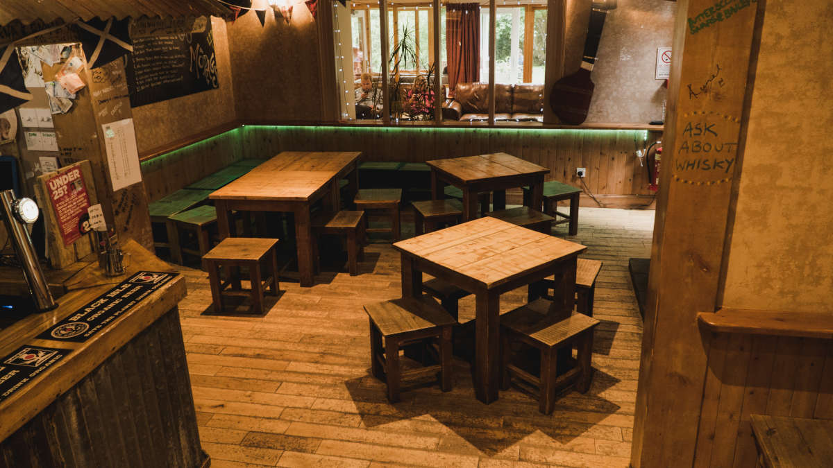 The rustic bothy-style bar offers a superb range of local beers and single malts, has a cosy log fire for the colder winter nights.